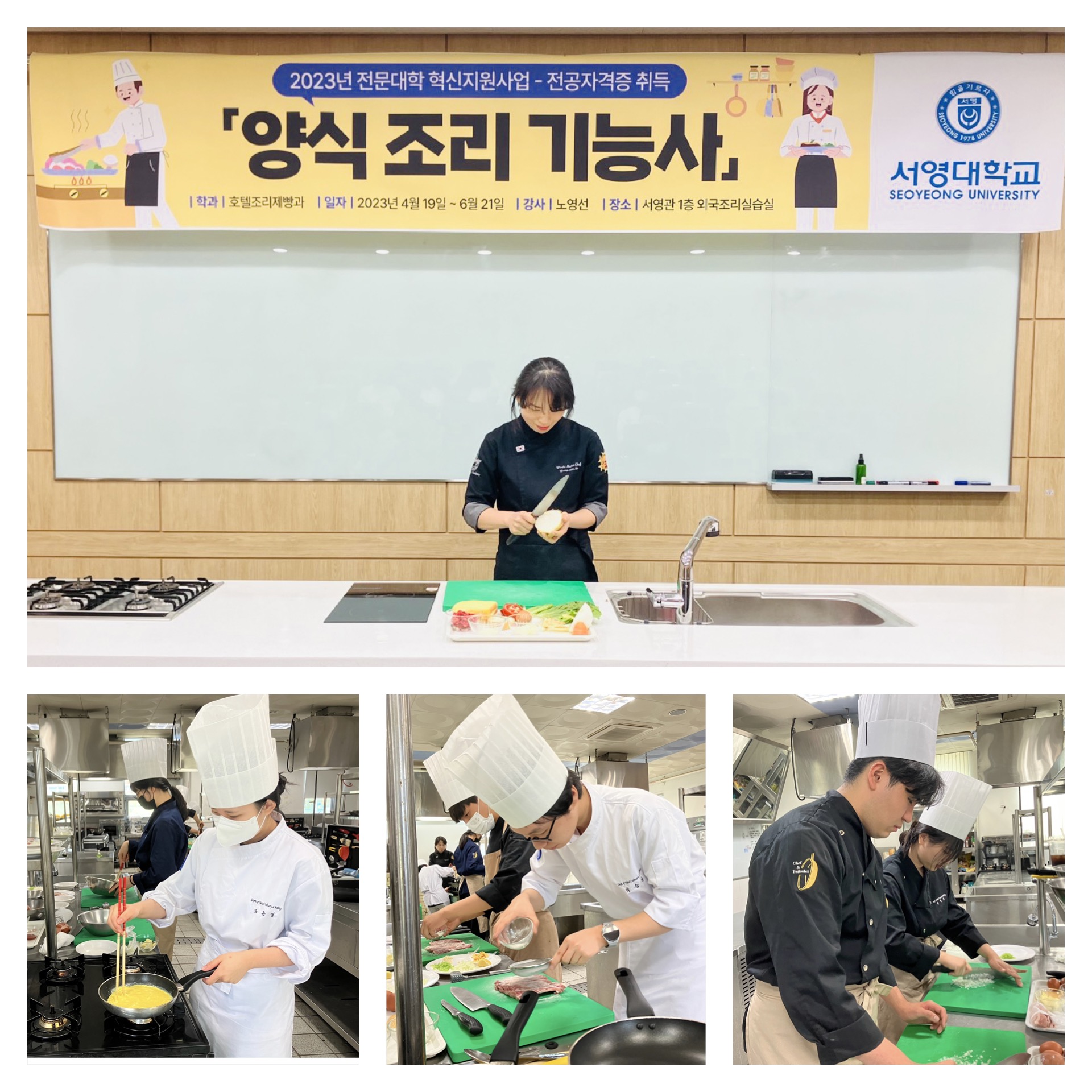 우리학과는 2023학년 전문대학 혁신지원사업 전공자격증취득으로 양식조리기능사과정을 1, 2학년 재학생 대상 전액 무료 특강을 진행하고 있습니다.
