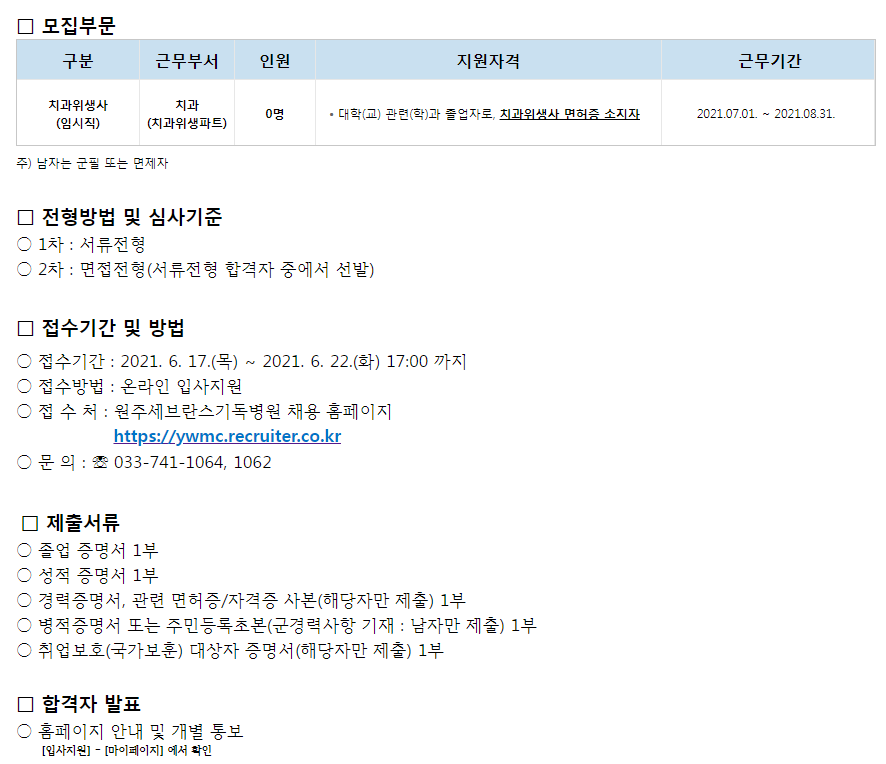 치과위생사(임시직) 채용 | | 접수기간 | 2021-06-17 ~ 2021-06-22 |
