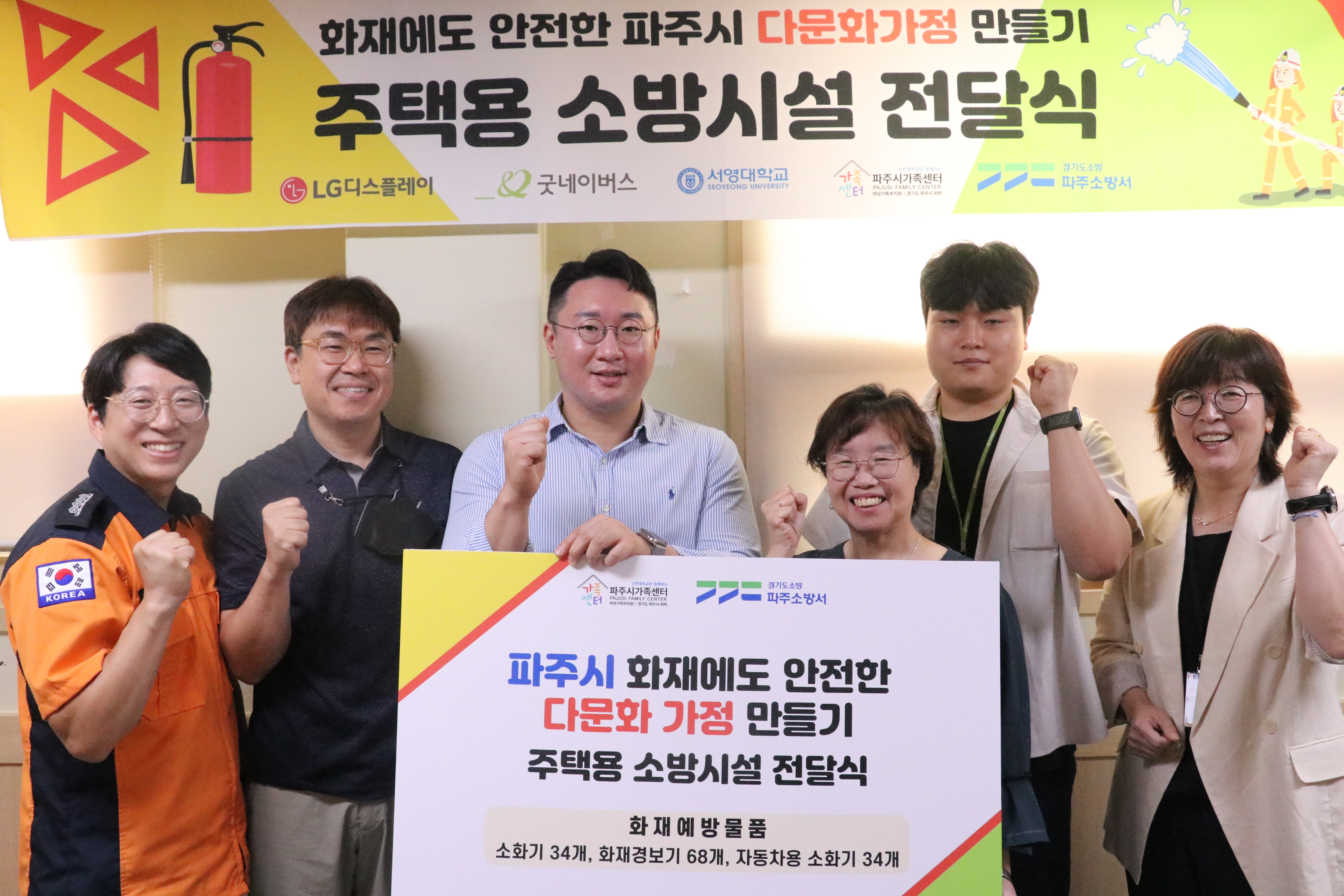 O.우리대학(총장 김정수)소방안전과(학과장 천종철)는7월28일(금)다문화가정을 위한‘주택용 소방시설 전달식’에 참여하였다.파주시가족센터에서 진행된 행사는 파주시가족센터를 통한 다문화가정 소방안전 물품 보급을 위한 계획에 따라 파주소방서(서장 정찬영)와 굿네이버스, LG디스플레이 및 서영대학교 교수지원단이 함께 참여하였다. O. ‘주택용 소방시설 전달식’에서는 파주관내 다문화가정34개소를 대상으로 주택용 소방시설에 대한 홍보와 소방용품 전달 및 방문설치가 진행되었다.이번 행사에서 우리대학 소방안전과에서는 다문화가정 소방시설 지원을 위한 화재안전물품(에어로졸)을 후원하고,가정 내 소방용품의 전달 및 방문설치에 동참하였다. O.파주소방서 정찬영 서장은‘다문화가정은 대체로 재난복지의 사각지대에놓여 있어 전방위적 지원이 필요하다.지역협의체를 통한 안전교육,예방물품의 지원 등이 지속적으로 이루어질 수 있도록 노력하겠다’고 전했다.서영대학교 교수지원단 이정균교수는‘지역내 다문화 가정에도안전문화를 보급하는 좋은 행사에 동참하게 되어 매우 뜻깊은 시간이었다.화재예방을 통한 안전사회 만들기에 앞으로도 열심히 동참하겠다.’고 말하였다.