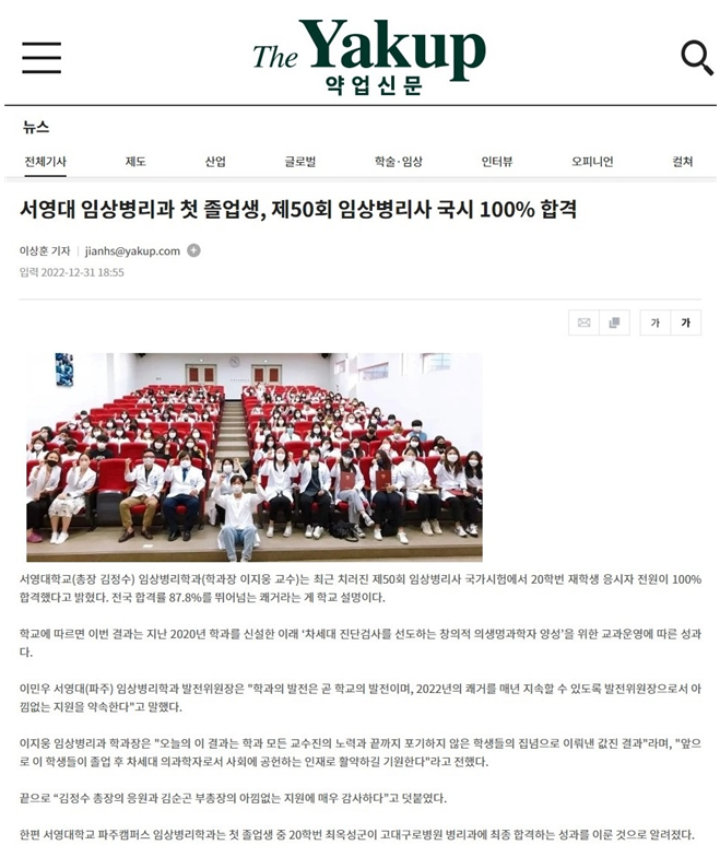 * 최강임상20학번이 제50회 임상병리사 국가시험에서 응시자 전원이 100% 합격하는 성과를 이뤘습니다. 모두 축하드립니다!
