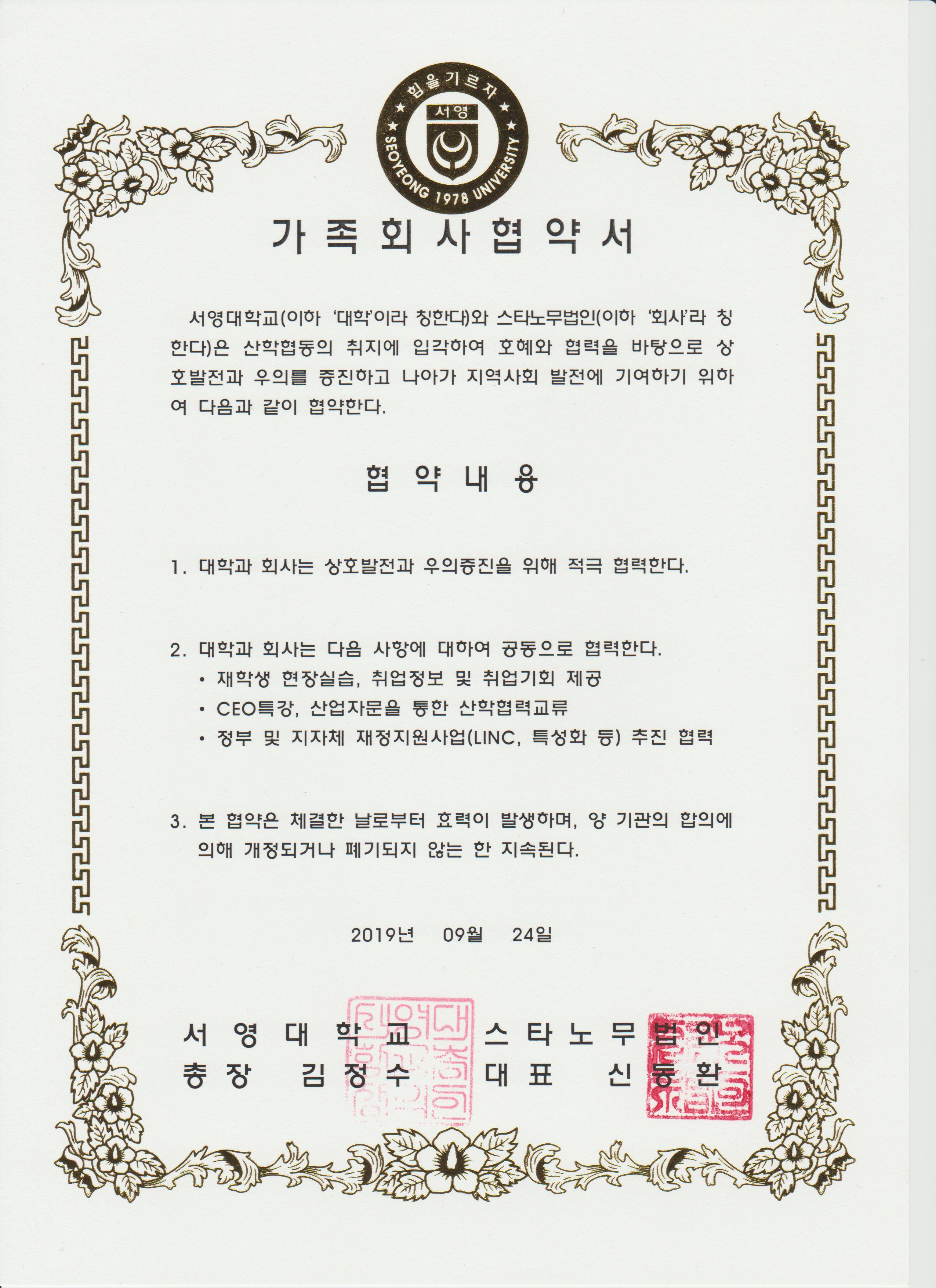 서영대학교 파주캠퍼스 임상병리과(학과장 이지웅)와 스타노무법인(대표 신동환 - 대한임상병리사협회 자문 대표 노무사)은 산학협동의 취지에 입각하여 호혜와 협력을 바탕으로 상호발전과 우의를 증진하고 나아가 재학생들의 취업에 있어서 산학협력교류 및 산업자문을 통해 유리한 조건의 취업이 되도록 노무관련 법률 지원을 위해 산학협약을 체결하였다.