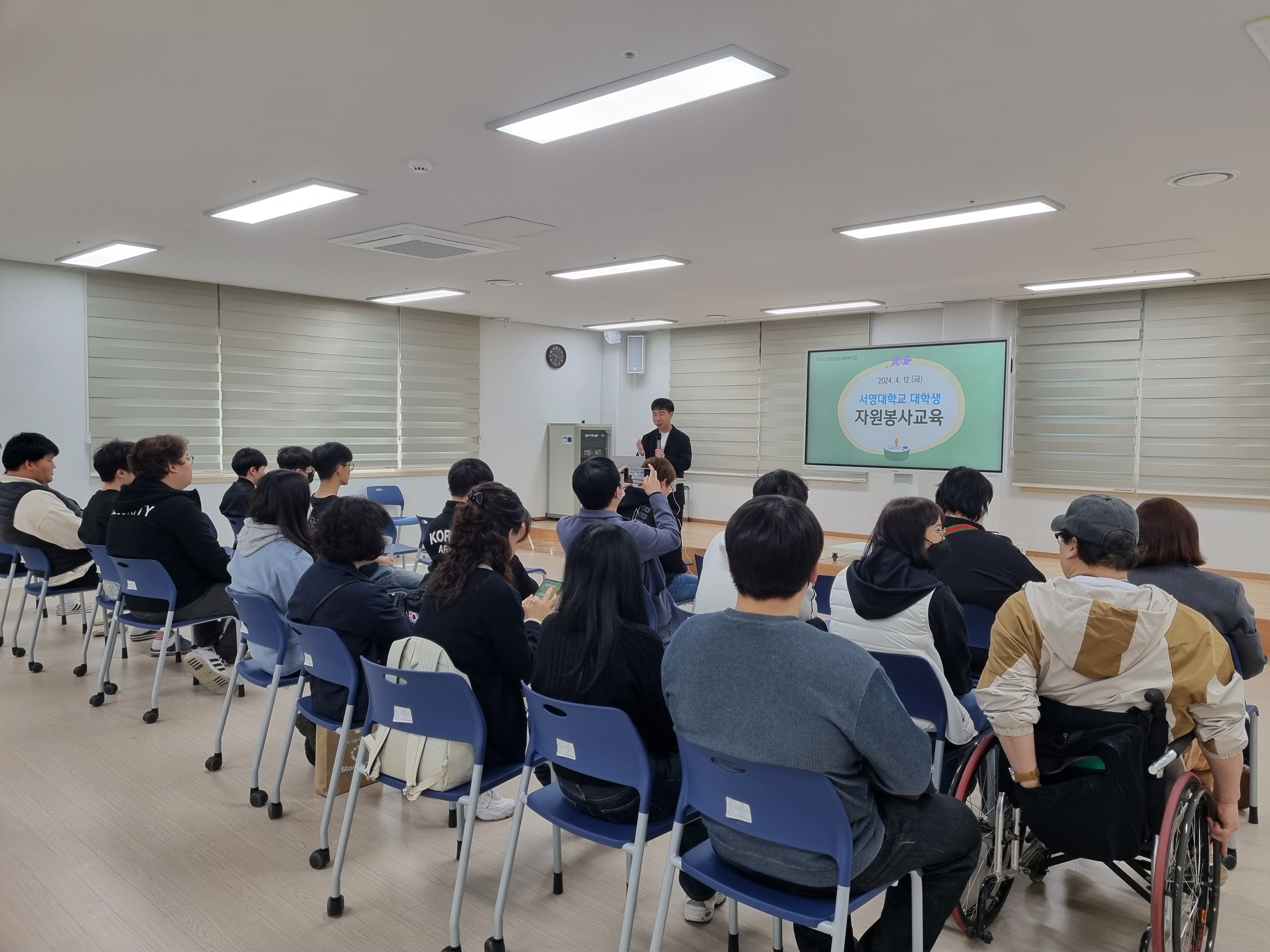 사회복지행정과에서는 4월 12일(금) 파주시운정종합사회복지관에서 지역사회봉사활동을 실시하였습니다. 자원봉사자의 기본자세와 태도에 대한 자원봉사 기초교육을 받은 후, 각자 배정받은 자원봉사활동을 실시하였습니다.
